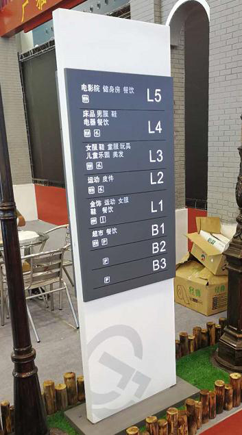 三級導(dǎo)視:從二級導(dǎo)視近一步的延伸,進(jìn)入到商場內(nèi)部。指示功能區(qū)域或者工作區(qū)域的。例如:大堂的索引牌、各百貨區(qū)或者功能區(qū)的指示、電梯間的辦公樓層指示牌、懸掛區(qū)域指標(biāo)牌等。